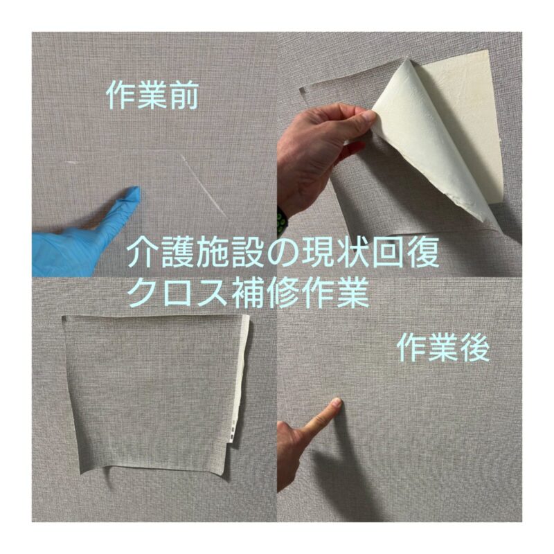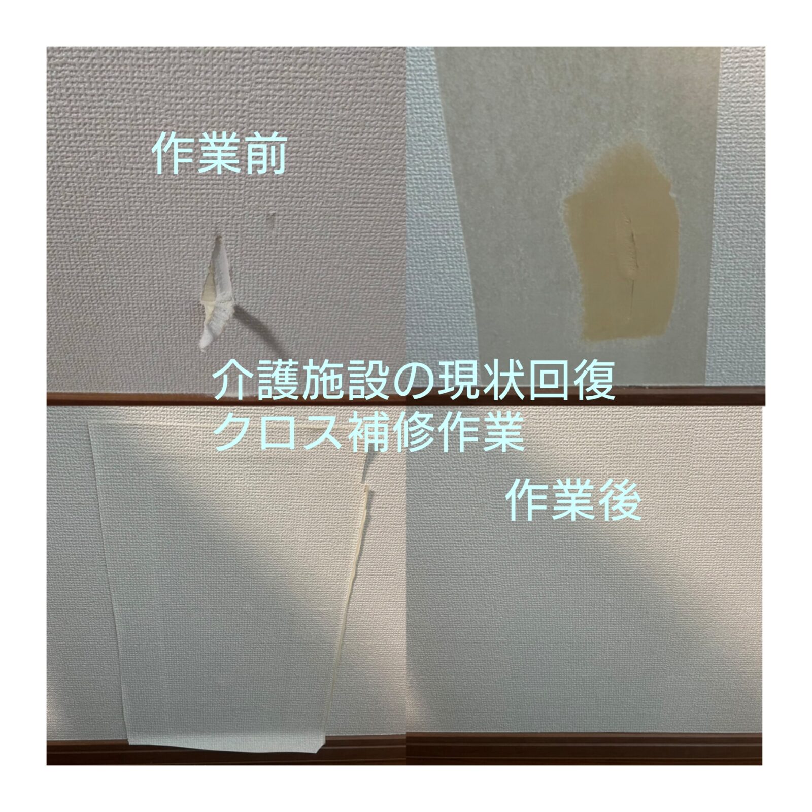 介護現場に付きものの、壁のキズや穴。 先日、職員様がベッド移動中にうっかりぶつけてしまった壁の補修を行いました。今回は、施設様が新築時から保管されていた「クロスの余り」を使用して対応。 同じロットの壁紙なので、色浮きもなく、どこにキズがあったか分からないほど綺麗に元通りになりました!