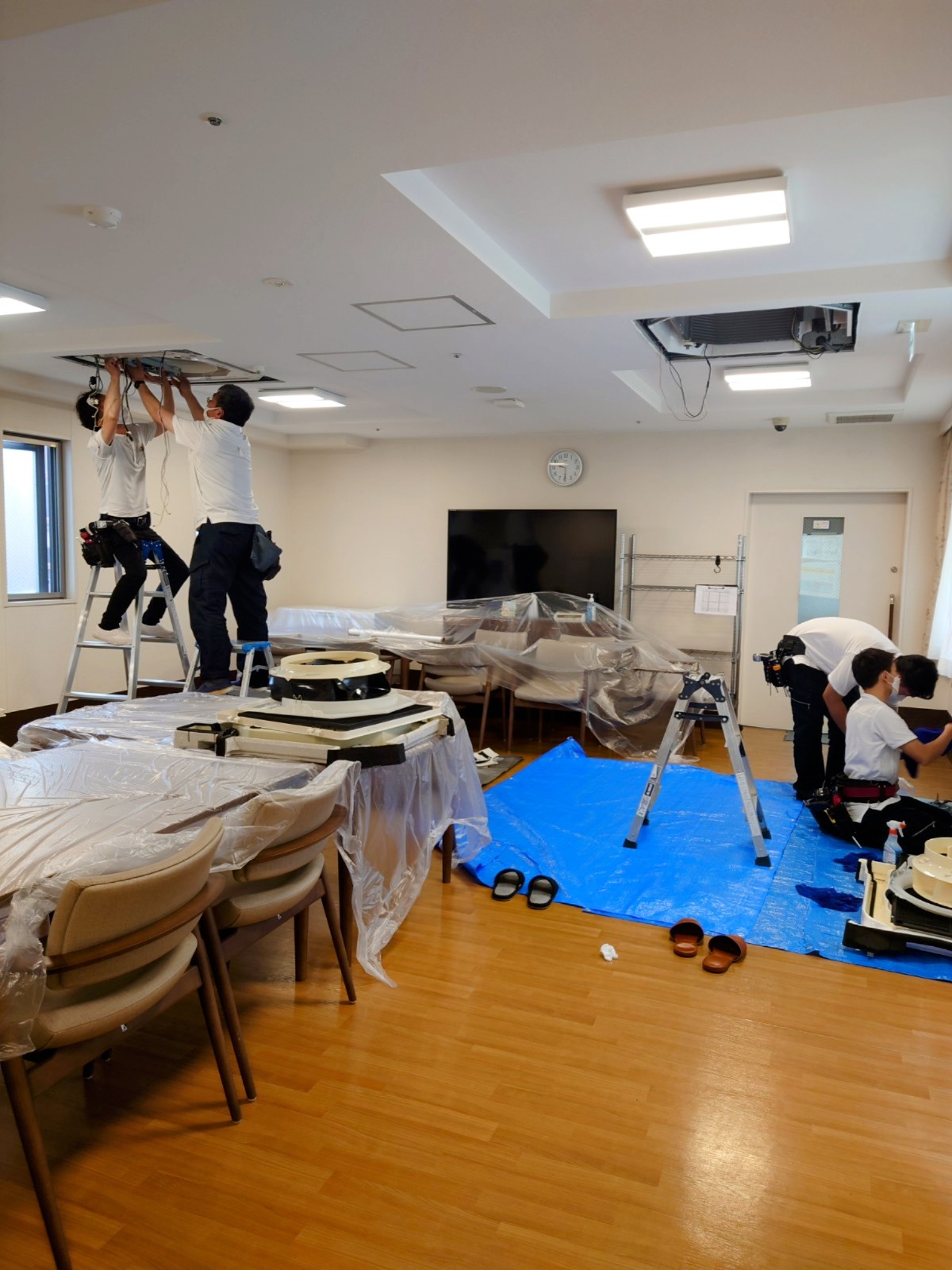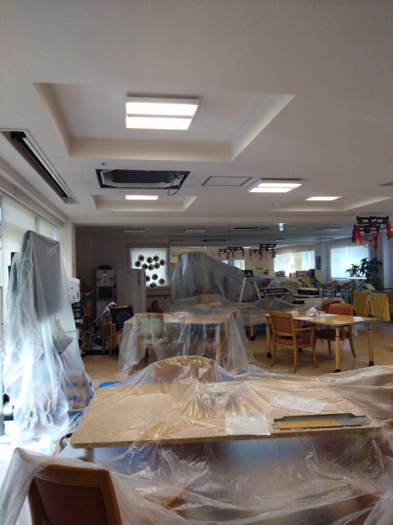 介護施設のエアコンクリーニングを行いました!食堂や事務所、廊下、洗面所など館内全ての天井埋込エアコンをしっかり洗浄いたしました。施設内は入居者様や職員さんと常に人通りがあるため、お邪魔にならないようスピード感を持って、安全第一で作業しています。 職員さんが事前に入居者様や荷物の移動をお手伝いしてくださり、作業はとってもスムーズに進めることができました☺️ ご協力に心から感謝いたします。